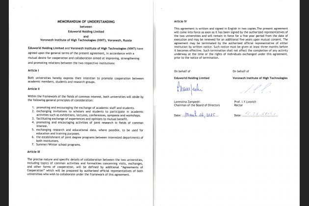 ВИВТ подписал меморандум о сотрудничестве с итальянским холдингом Eduworld Holding Limited (Италия, Мальта).